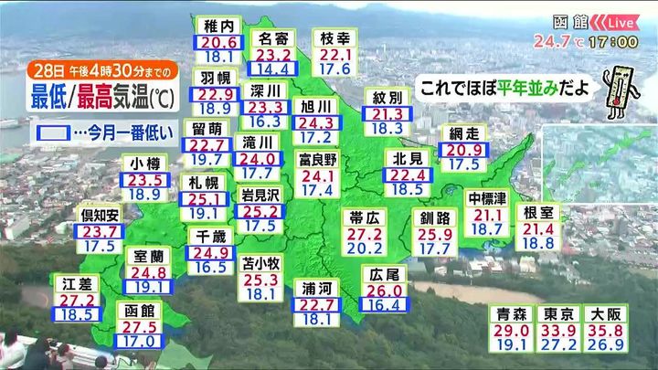 きょう28日(木)は少しだけ秋の気配を感じましたね。気温を振り返ります。青枠は今月一番低くなった地点です。下の段、朝は函館など道南方面で今月一番涼しくなりました。日中は日本海側やオホーツク海側で今月一番低い最高気温で、札幌は25.1度でした。ちなみに、大阪は35度以上の猛暑日でした。温度計君が言ってますが、道内ではこれでほぼ平年並みの気温です。