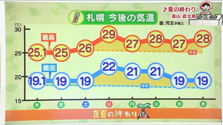 この先の札幌の予想気温を見ると、来週は少し暑さが戻って、日曜の最高気温は29度ですが、30度以上の真夏日はなさそうです。最低気温も日曜は22度ですが、全体的には20度前後で寝苦しい夜も少ない見込みです。夏の終わりというには少し早いので、「真夏の終わり」とお伝えします。