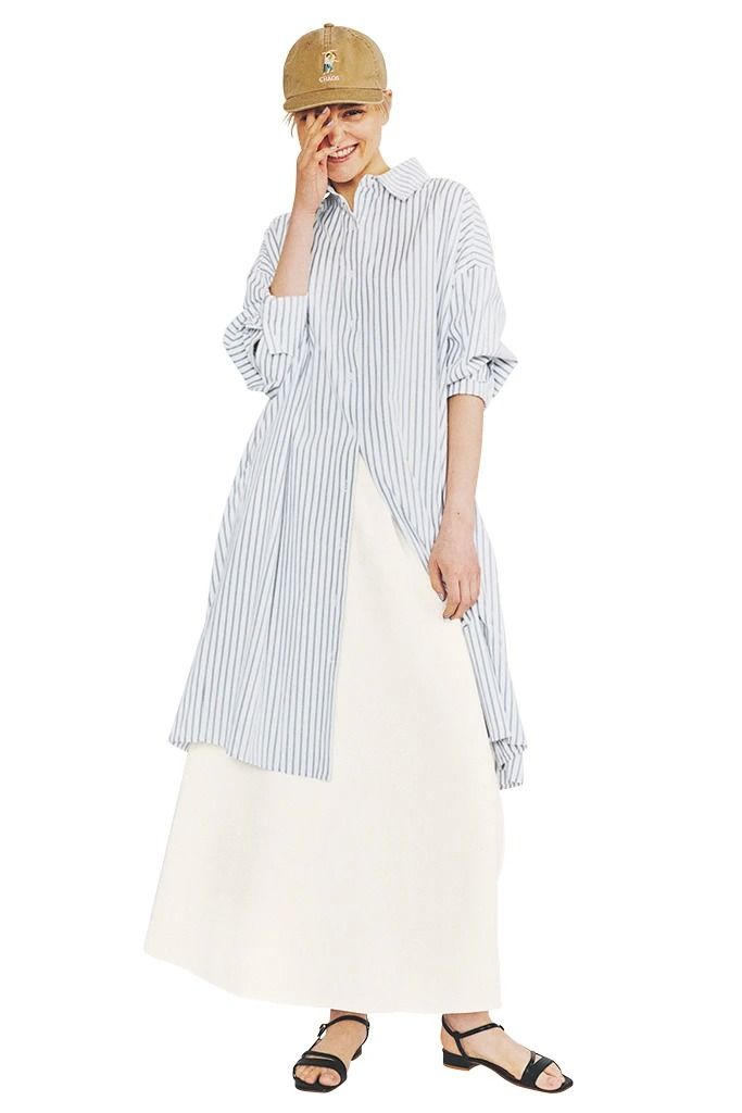 ベストのように着られるリネンジレを合わせてほぼ白のワントーンをスマートに更新。穏やかな印象のローファーで親近感も獲得。