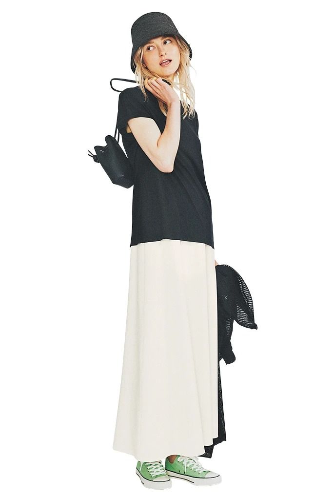 緑の明るい発色が引き立つよう小物は黒で統一。ロングスカートとも相性がいいローカットを選んで、抜け感も確保。