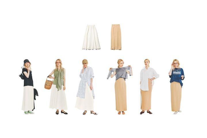 【全15スタイルの一覧】≫シンプルなスカートの「コンサバじゃない着回し方」変化量の大きい「小物の足し引きテクニック」