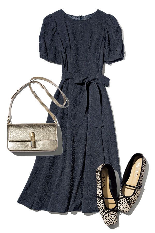 ウエストをリボンで絞った令嬢ライクワンピなら、メタリックなキラキラバッグとアニマル柄のビターな可愛さを品よくキャッチ。真面目すぎず、抜け感あるブラックコーデに。