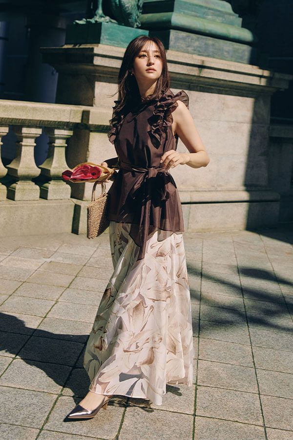 ウエストできゅっと結んだリボンでスタイル美人に。ボトムの花柄スカートもブラウントーンを選んで大人っぽくシックに。