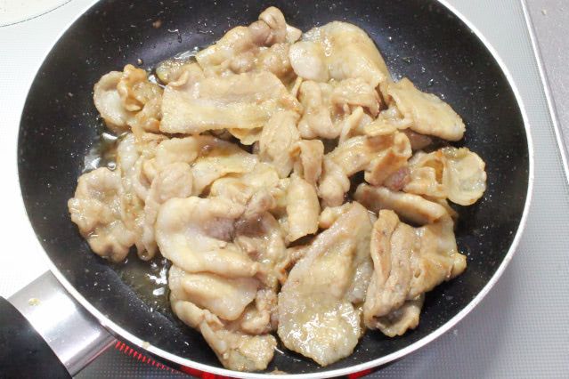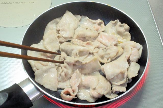 中火で5分ほど炒めると、豚肉にうっすらと焼き色が付きました。豚肉から出た余分な油はキッチンペーパーで吸い取りました。