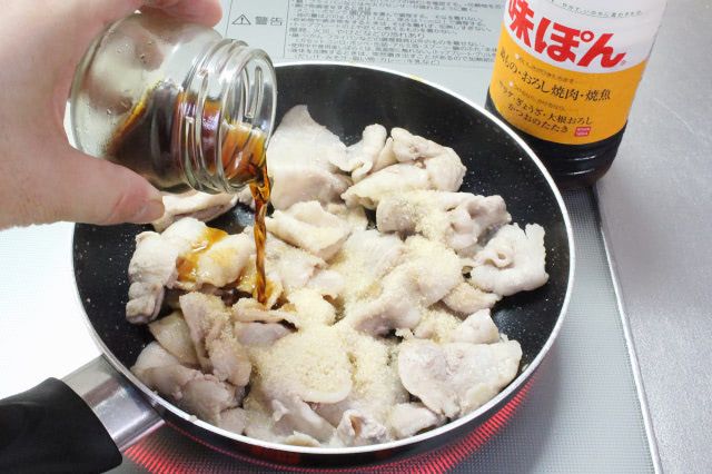 2. フライパンにサラダ油を引き、中火で熱します。豚肉の色が変わる程度に炒めたら、味ぽんと砂糖を加えて、汁気がなくなるまで炒めます。