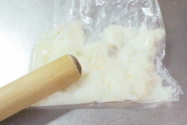 麺棒で長芋を叩くと簡単に砕け、すりおろしたようになりました。ぬるぬるとする長芋を手で触らずに済むので、とっても楽♪
