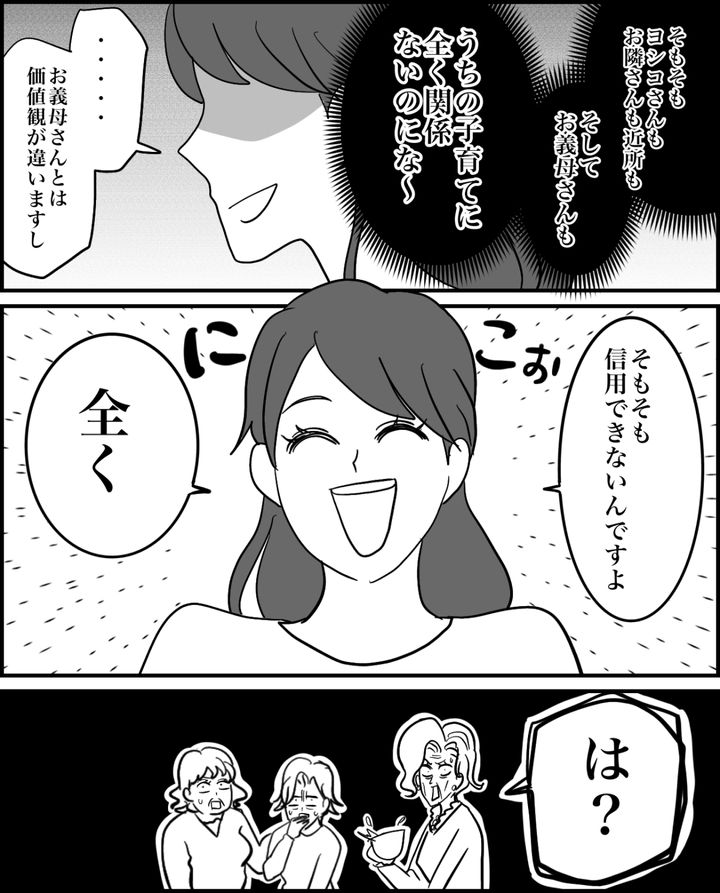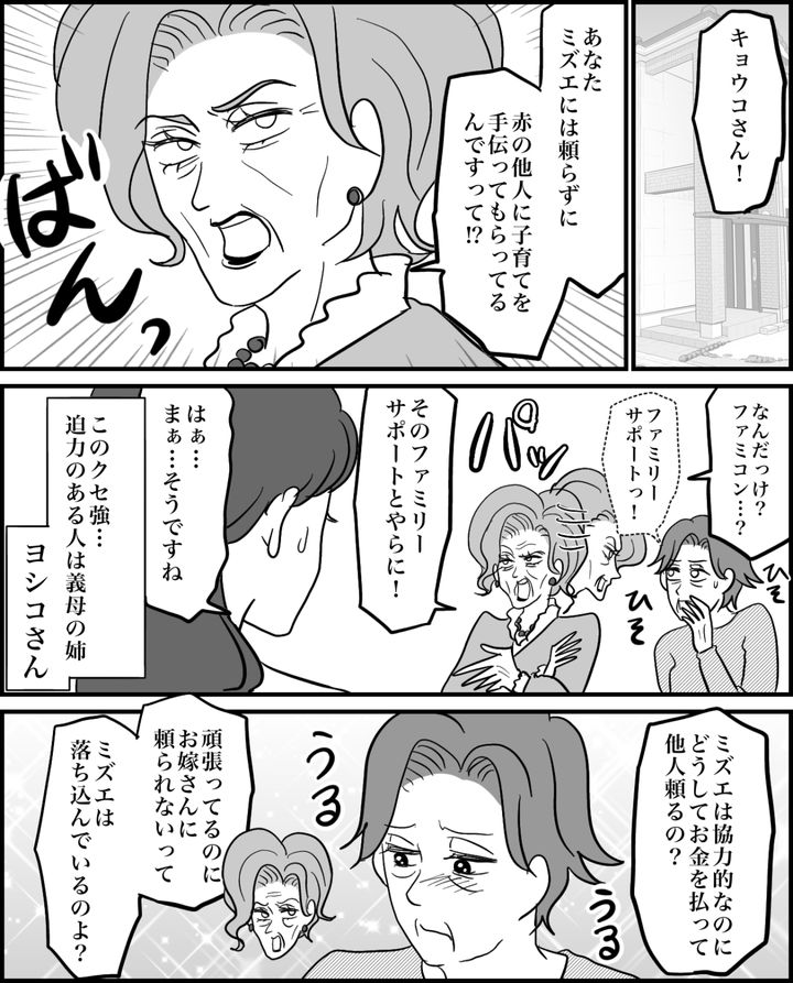 ファミサポの利用を巡り、なぜか義母の姉であるヨシコさんや、義母と仲良しのご近所さんから責められている状況……。ワケが分かりません。義母本人から文句を言われるならまだしも、なぜ無関係のヨシコさんやご近所さんから? 大勢で責めれば、私が屈するとでも思ったのでしょうか。
