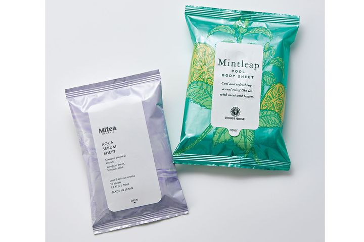 左から:さっぱり拭けて北極級のひんやり感。体も顔にも使える。Mitea ORGANIC アクアセラムシート 10枚入り 50ml ¥539※数量限定(ビープル)クールな化粧水をたっぷり含んだ天然素材の大判シート。ミントリープ クール ボディシート 20枚入り 122ml ¥660※限定(ハウス オブ ローゼ)