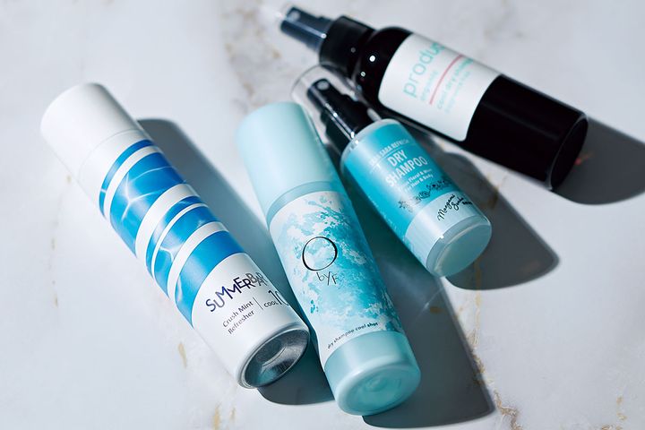 左から:炭酸濃度10,000ppm。凍るような冷たさで熱い頭皮をケア。サマーバー クラッシュミント リフレッシャー クール 10 70g¥1,540(夏季限定、デミ コスメティクス)ベタつきや臭いの元を吸着して軽やかな髪に。冴える冷感がじわじわと持続。O by F スキャルプドライシャンプー クールショット 100ml ¥2,420※数量限定(ビープル)スーッと冷やしながらペタッとした前髪をふんわりリペア。前髪専科さらさらリフレッシュドライシャンプー 60ml ¥1,100(ハーベス)冷感がパワーアップ。スプレーした瞬間に肌温度−5℃を叶える。ザ・プロダクト クールドライシャンプーff 115ml ¥1,430(KOKOBUY)