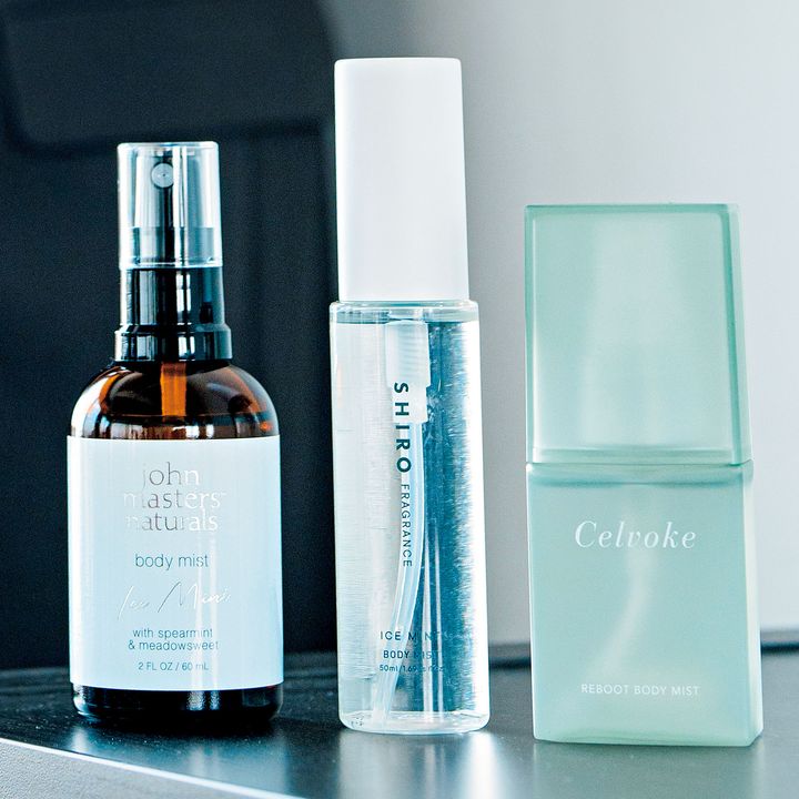 左から:ペパーミントや和ハッカなど自然由来の香り成分をブレンド。ひと吹きでクールダウン。S&Mボディミスト アイスミント 60ml ¥2,530※数量限定(ジョンマスターオーガニック)汗に反応して冷感がアップ。フレッシュな柑橘の香り。アイスミント ボディミスト 50ml ¥1,980(シロ)暑さをリセットしながら、森林浴のような香りでニオイもケア。Celvoke リブート ボディミスト N ドーンフォレスト 50ml ¥2,970※数量限定(ビープル)