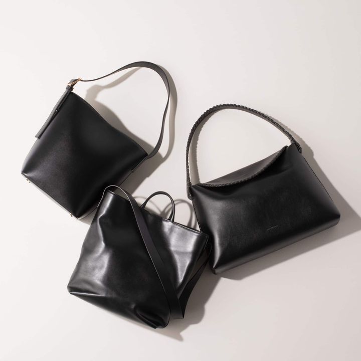 <中央>メゾン カナウ[H33×W28×D12cm] ¥90,200 削ぎ落とされた、シンプルなデザインが美しい究極のBLACK。イタリアのファクトリーで製作されている注目のバッグブランドです。内側にはファスナー付きポケットと小ポケットが1つずつ。トップはマグネットで止められる仕様になっています。