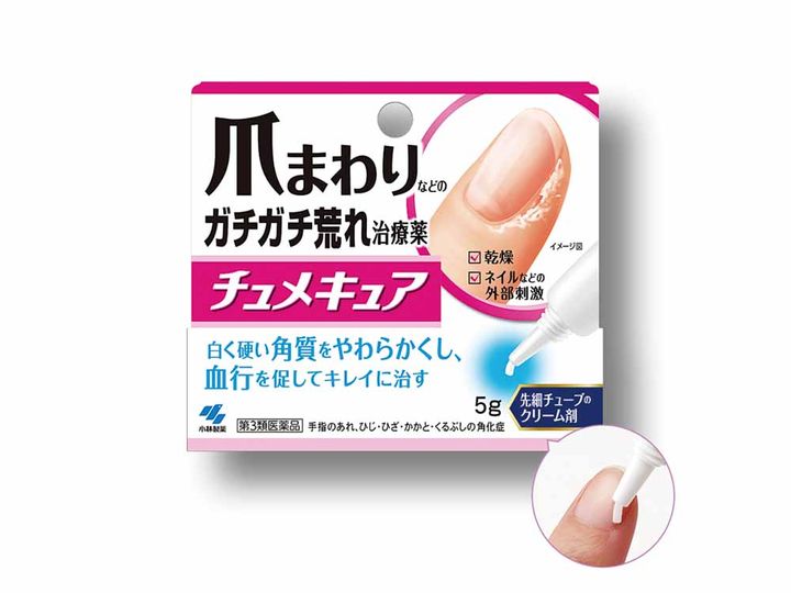 乾燥やネイルなどの外部刺激が原因で白く硬くなった爪まわりの角質を、有効成分が柔らかくして血行を促してキレイに治す治療薬。