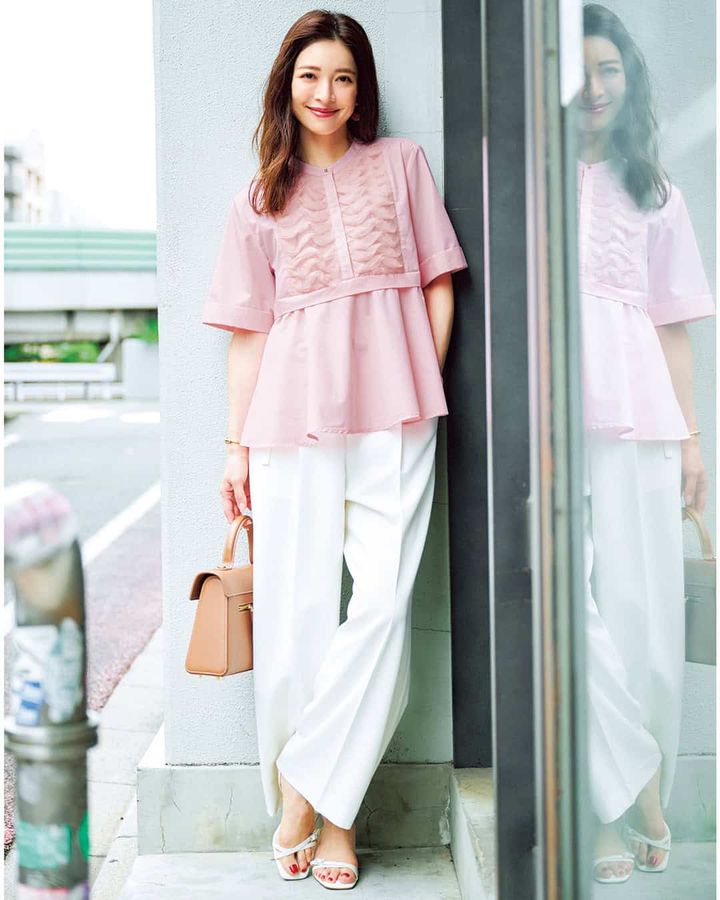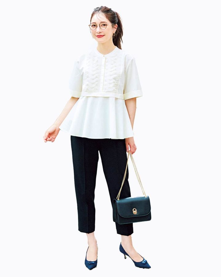 【2枚目】ブラウス¥16,940(トラッツォドンナ)パンツ¥22,990(アンクレイヴ/アンクレイヴ〈オンワード樫山〉)バッグ¥13,750(アルテミス by ダイアナ/アルテミス by ダイアナ アーバンドックららぽーと豊洲店)メガネ¥39,600(ブラン/ライト)ピアス¥99,000(ココシュニック)シューズ/スタイリスト私物