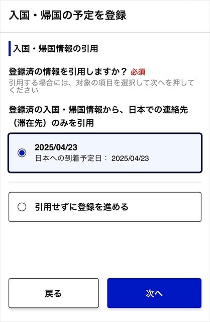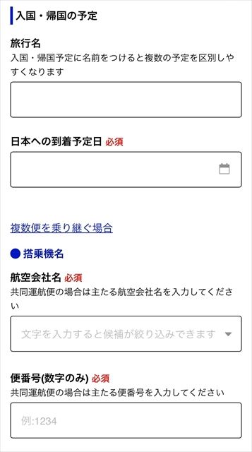 そのときに、「登録済の入国・帰国情報から日本での連絡先(滞在先)のみを引用」を選択すると、日本への到着予定日、航空会社名、便名、出発地のみを入力すればいいだけなので、手間を省くことができます。