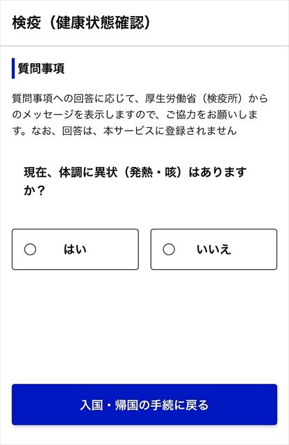 検疫は、健康状態の質問にはい/いいえで回答。