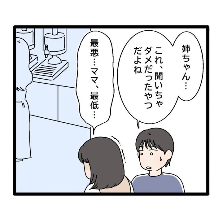 「姉ちゃん・・・これ、聞いちゃダメだったやつだよね」と深刻な顔でサクラちゃんに言うリョウくん。サクラちゃんは自分の母親の様子を目の当たりにして震えながら「最悪・・・ママ、最低・・・」と呟いていました。