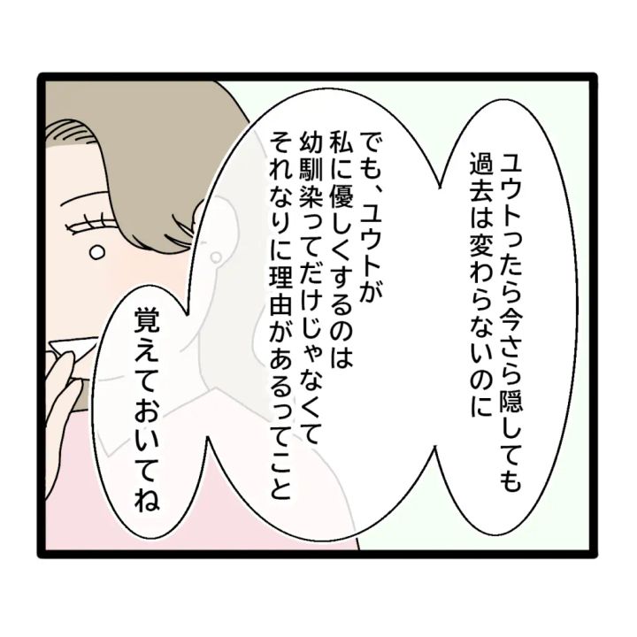 「ユウトったら今さら隠しても過去は変わらないのに」と、また勝ち誇った笑み。そして、「ユウトが私に優しくするのは幼馴染ってだけじゃなくて、それなりに理由があるってこと覚えておいてね。」と言いました。本当に仲良くする気があるのでしょうか。