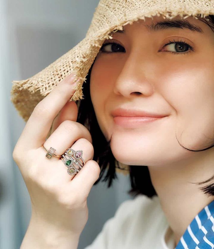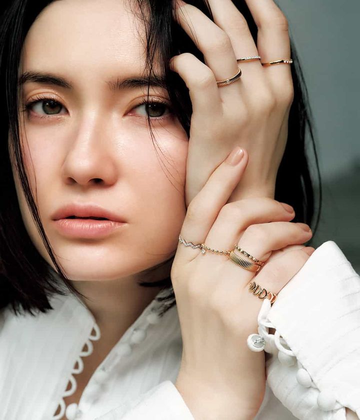 透明感はゴールドベースにプラチナ投入がカギ。左手リング〈人差し指〉[K18YG]¥110,000〈中指〉[Pt950]¥80,300〈薬指〉[K18YG]¥121,000右手リング〈人差し指〉[Pt950]¥93,500〈中指〉[K10YG]¥35,200〈薬指上〉[K10YG]¥38,500〈薬指下〉[K18YG]¥176,000〈小指〉[K18YG]¥106,700(すべてスタージュエリー/スタージュエリー表参道ヒルズ店)ブラウス¥33,000(カデュネ)