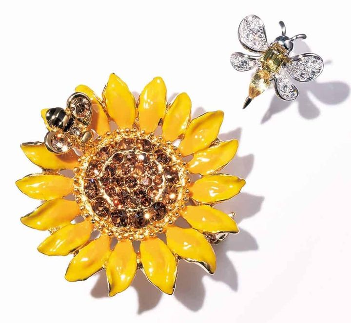 ハチブローチ[Pt950、サファイア0.47ct、DIA 0.20ct]¥550,000(NADIA/Maison de NADIA 銀座本店)ひまわりブローチ[合成樹脂、ガラス]¥17,600(ヴァンドームブティック/ヴァンドームブティック 銀座三越店)