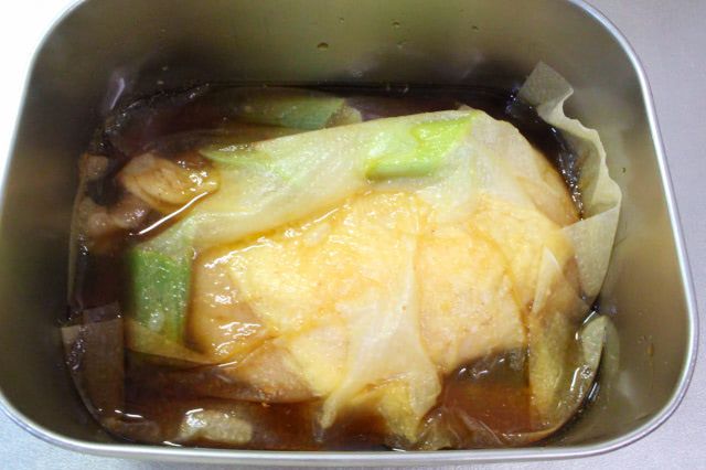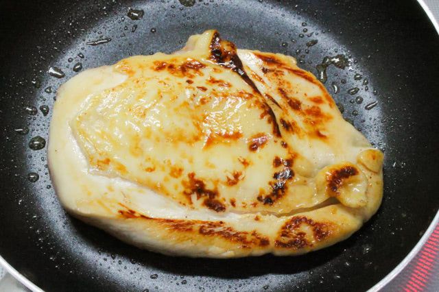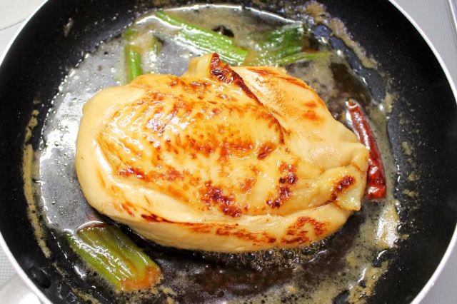 ひっくり返して身側を火入れします。パサつきやすい鶏むね肉が硬くならないよう、ごく弱火にするのがポイント。煮汁が泡立たないくらいの火加減で3分ほど煮ました。