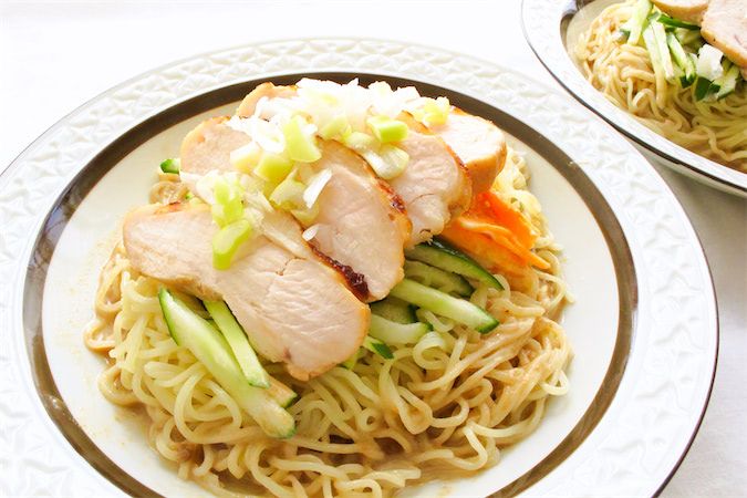 暑い日には、冷たい麺料理がぴったり♪中でも、ゴマだれの冷やし中華は筆者の大好物で、麺とたれがセットになった市販品でよく作ります。そんな気軽に作れる冷やし中華も、元2つ星フレンチシェフが作ると本格的に!鶏むね肉をたれに漬け込んで鶏チャーシューを作り、そのたれに練りゴマや白ワインビネガーなどを混ぜて、ゴマだれに仕上げていました。というわけで、YouTube『Georgeジョージ』で見つけた「冷やし中華」に挑戦!