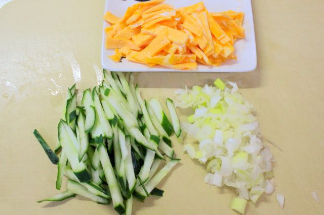 3. きゅうりを千切りに、長ねぎの白い部分を粗みじん切りにします。薄焼き卵を焼いて、細切りにしておきます。