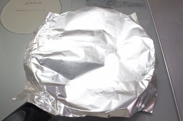 最後に余熱で火を通します。フライパンを密閉出来るフタがないので、今回はアルミホイルを被せて5分ほどおきました。