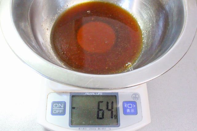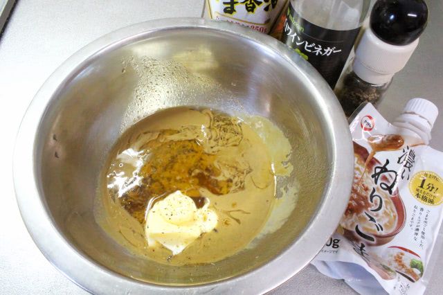今回は煮汁64g、練りゴマと白ワインビネガーを各大さじ4ずつ、マヨネーズとゴマ油を各大さじ1、黒こしょうを適量加えて、特製ゴマだれを2人分作ります。