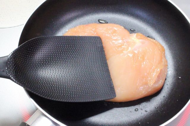 4. フライパンにオリーブオイルを引き、中火で熱します。2の鶏肉のたれを拭き取り、皮目を下にして焼き色が付くまで焼きます。
