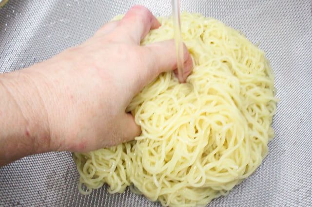 8. 沸騰したお湯(分量外)で袋の記載時間通りに麺を茹で、流水でしっかりと洗って冷やします。