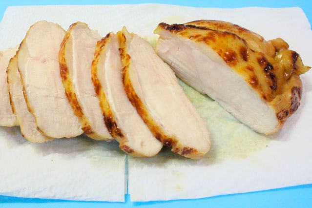 余熱調理を含め、両面でトータル16分火入れした鶏肉を切ってみると、しっとりとやわらかく均一に火が通っていました。皮目は焼き色が付き、たれの色が染みているので、鶏むね肉とは思えない仕上がりに!