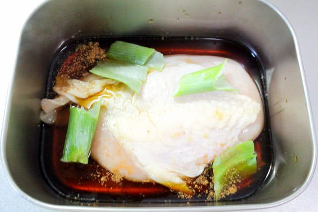 2. しょうゆ、酒、みりん、蜂蜜、しょうが、にんにくを混ぜて、1を入れます。手で適当にちぎった長ねぎの青い部分とシナモンを加え、キッチンペーパーを被せて20分ほど漬けます。