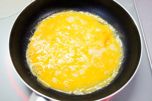 フライパンにオリーブオイルを引いて、弱火で熱します。溶き卵を流し入れ、焼き色が付かないように3分ほど焼き、火を止めてフタを被せ、表面が乾くまで余熱で火を通しました。