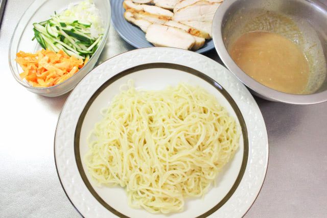 沸騰したお湯で2分30秒ほど麺を茹で、流水で洗って粗熱を取り、今回は氷水に2分ほど浸けて冷やしました。