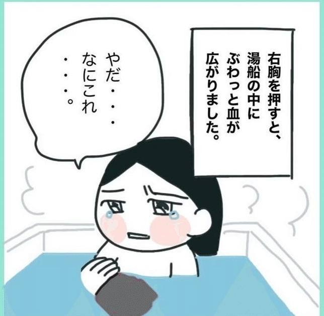 営業職ということもあり、毎日1万歩以上歩いているというユウコさん。特に体に不調も見られないようですが、あるとき、お風呂で湯船につかっていると右胸から出血がありました。
