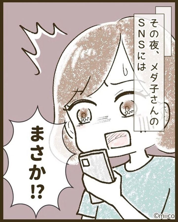 ある日、園の駐車場で車が傷つけられたと騒ぐメダ子を見つけたのんちゃんママさん。隣に停めていたママに何やら文句を言っているようです。しかし、タイミング的にも自分ではないときっぱり否定され、メダ子は怒り心頭。