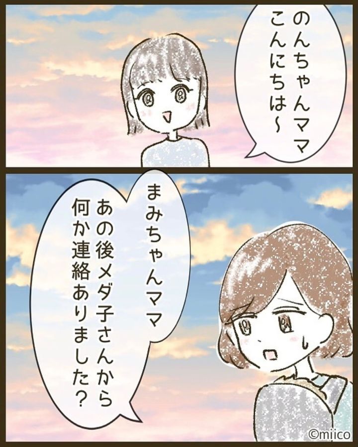 まみちゃんママに、メダ子の車に傷がついていた真相を伝えたのんちゃんママさん。まみちゃんママは驚いていたものの、怒ることもなく「解決してよかった」という一言で終わらせてしまいました。