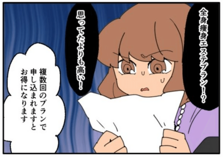 ハルミは体験プランのアンケートに記入しながら、自分の体の変化や悩みについてサロンスタッフに相談しました。すると、スタッフから全身痩身エステという高額なプランを勧められました。