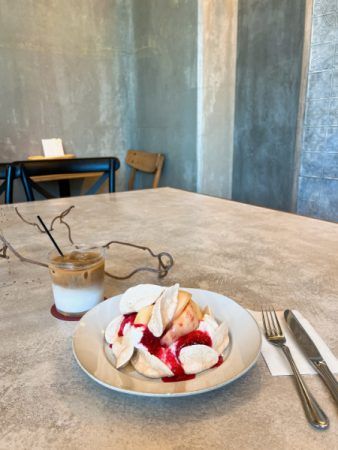 ナイフでメレンゲと桃をカットしながらいただきます。メレンゲはとてもサクサクで、きび砂糖の甘さが口に広がります。 パブロバというものを初めて食べたのですが、メレンゲの甘さとグリークヨーグルトの相性が良く、いろいろな食感も楽しめて美味しいです。 土台がメレンゲのため、とてもボリュームがあります。これだけで結構お腹いっぱいになります。 食後のデザートとして注文するなら、シェアして食べるのがいいかも。 私は甘党なので一人でぺろりといただきました。