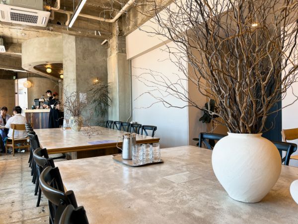 こちらのお店は銀行跡地をリノベーションしているのですが、とってもお洒落。 コンクリート打ちっ放しの店内に、大きな窓から光が差し込み明るい雰囲気です。お洒落なグリーンもたくさん飾ってあります。