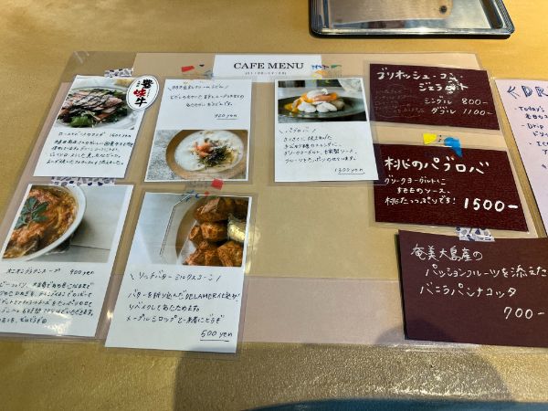 11時以降は、カフェメニューになります。 デザートメニューはプリンやジェラート、ガトーショコラ、バスクチーズケーキ、ロールケーキなど。 季節のフルーツを使用したメニューもたくさんあります。この日は奄美大島産のパッションフルーツを添えたパンナコッタや、ブリオッシュにジェラートとアメリカンチェリーのソースを添えたブリオッシュ・コン・ジェラートなど。 時期によりメニューは異なるため、最新情報はInstagramで確認してください。