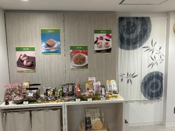 和菓子は日本の四季移ろいを表現したお菓子なので、ポスターにはそれぞれの季節が感じられる和菓子のポスターが飾られています。棚には、水ようかん、黒棒などの昔ながらの和菓子が置かれています。