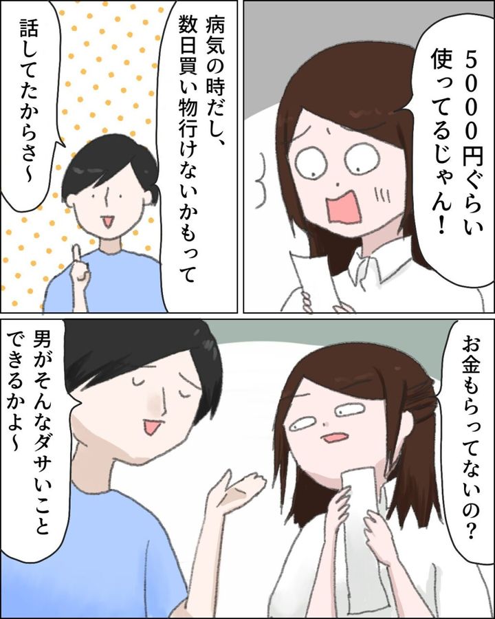 「病気の時だし、数日買い物行けないかもって話してたからさ~」平然とそう言う夫に、「お金もらってないの・」と真顔で聞き返すと、「男がそんなダサいことできるかよ~」と言うのでした。