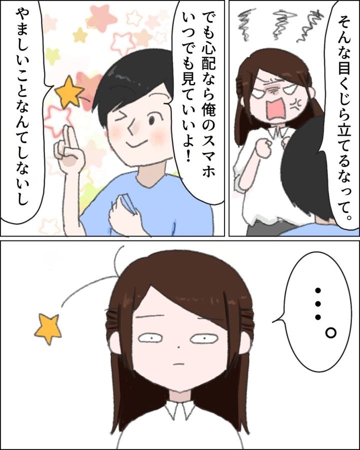 「そんな目くじら立てるなって。でも心配なら俺のスマホいつでも見ていいよ!やましいことなんてしないし」と言いながらウインクする夫を見て、「・・・」と絶句してしまいました。