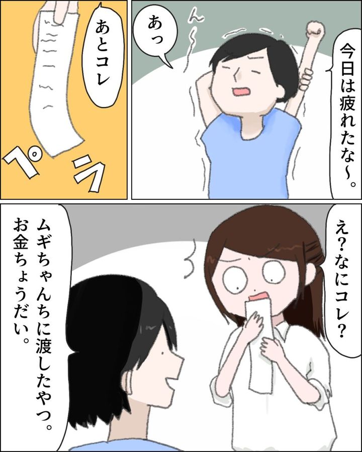 その後、「今日は疲れたな~」と伸びをして、「あ、あとコレ」と差し出したのはレシート。「え?なにコレ?」と言うと、「ムギちゃんちに渡したやつ。お金ちょうだい」と言い出す夫に、