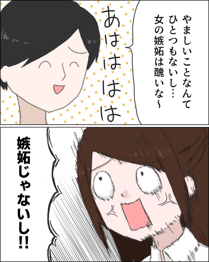 さらに「やましいことなんてひとつもないし・・女の嫉妬は醜いな~。あはははは」と笑いながら言う夫に、「嫉妬じゃないし!!」と思いっきり否定すると、