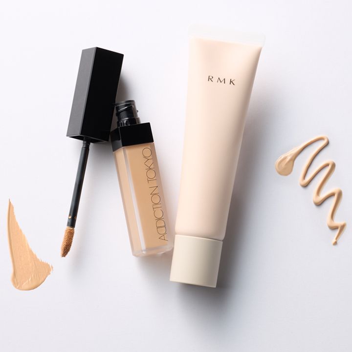 下地は変に白浮きせず自然に肌トーンが整うベージュ系の色がオススメ。コンシーラーはツヤ系よりマット系を選ぶことでベタつかない涼やかな印象に。右:軽やかなテクスチャーで毛穴をぼかして目立たなく。厚塗り感はないのに気になる肌のアラはカバーしてくれる優れモノ。厳選された5種の保湿成分が肌をうるおわせつつ、さらっとベタつきのない肌に。RMK リファイニング ポアレス スキン ベース 02 SPF8 PA+ 35g ¥4,400 (RMK Division) 左:薄膜で高密着。光を反射してツヤをもたらしながら、自然な素肌感が長時間持続。クマやシミ、色ムラなど、肌悩みにピンポイントで対応。アディクション スキンリフレクト フィックス コンシーラー 010 ¥3,850 (アディクション ビューティ)