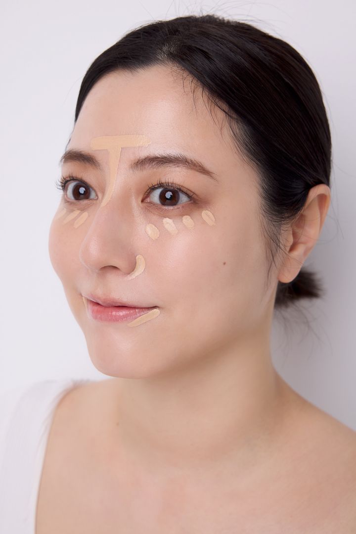 クマや肝斑をカバーするために、コンシーラーを目の下に4点置き。さらに、テカリ防止のためにTゾーン、赤みの出やすい小鼻周り、下がって見えがちな口角にもオン。下地と同系統のカラーを使うことで厚塗り感のない仕上がりに。コンシーラーは伸ばし塗りではなくぼかすようにタッピングして馴染ませるのが正解。