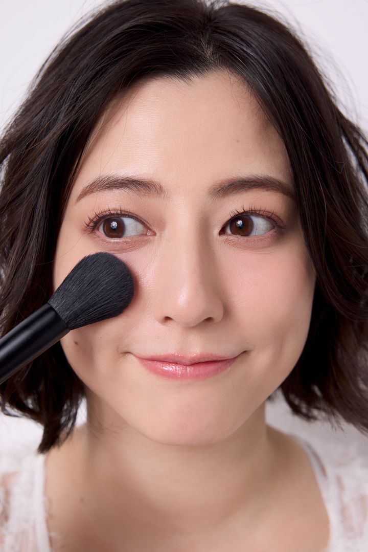 顔をふっくら多幸感に仕上げたいなら華やかなピンクチークがオススメ。チークは涙袋の下から小鼻の横付近にかけて大きめに入れることがポイント。この位置に入れることでクマやくすみを自然にカバーしながら、顔全体が明るい印象に。