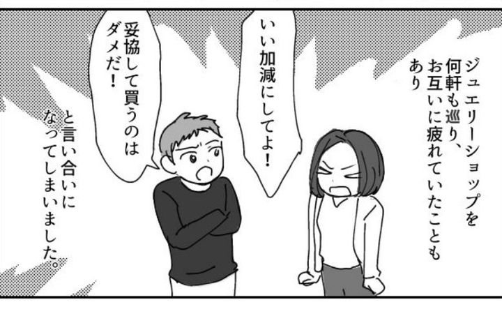 ジュエリーショップを何軒もまわり、お互いに疲れていたこともあり、「いい加減にしてよ!」「妥協して買うのはダメだ!」と言い合いになってしまいました。